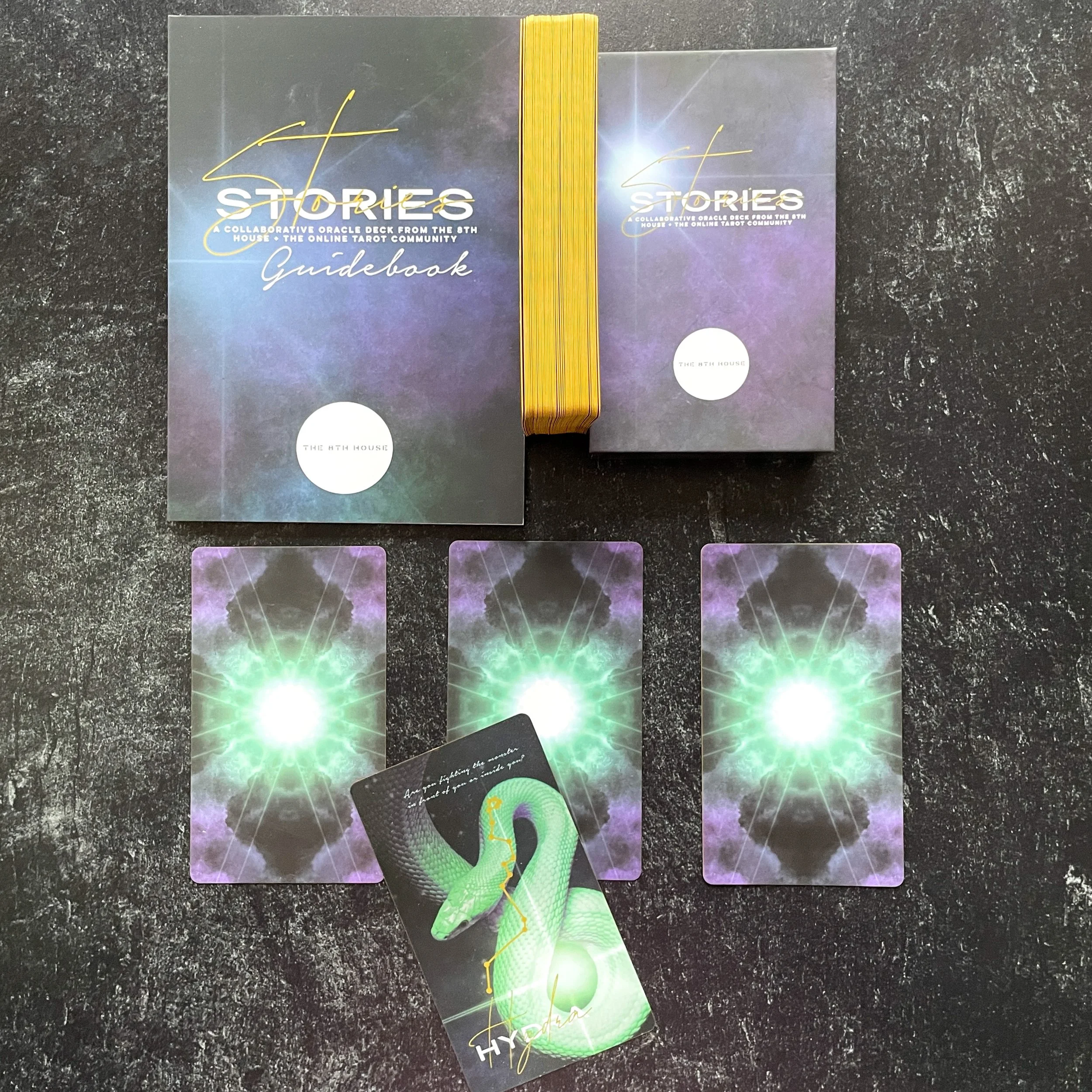 Stories is the first oracle deck from the 8th house. Constellations with a mythological backstory were chosen, and the guidebook was compiled entirely of story submissions from people in the online tarot and astrology community. Each person re-told their myth in a modern way, and artwork for the cards was driven by the stories submitted.